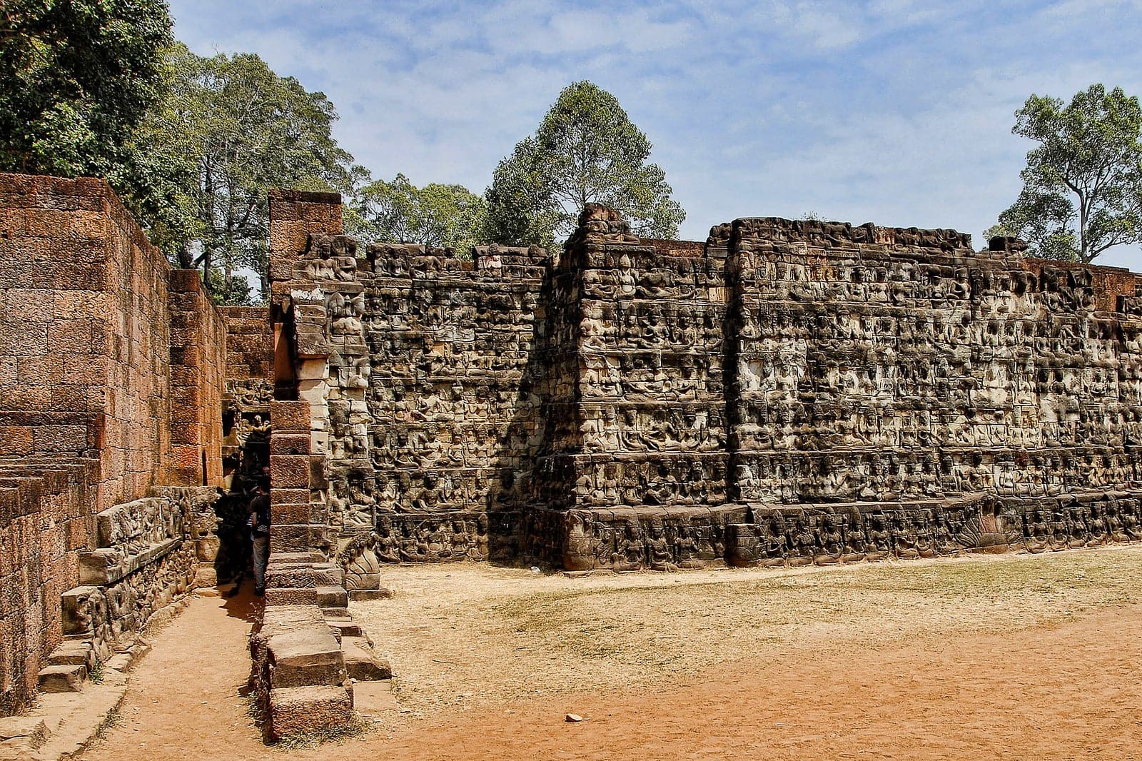 The Terrace of the Leper King has carvings of nagas (dragons), demons and various mythical beings.  The inner wall was built first, and the outer wall was added later covering the inner wall. Archaeologists excavated the inner wall in the late 1990s.